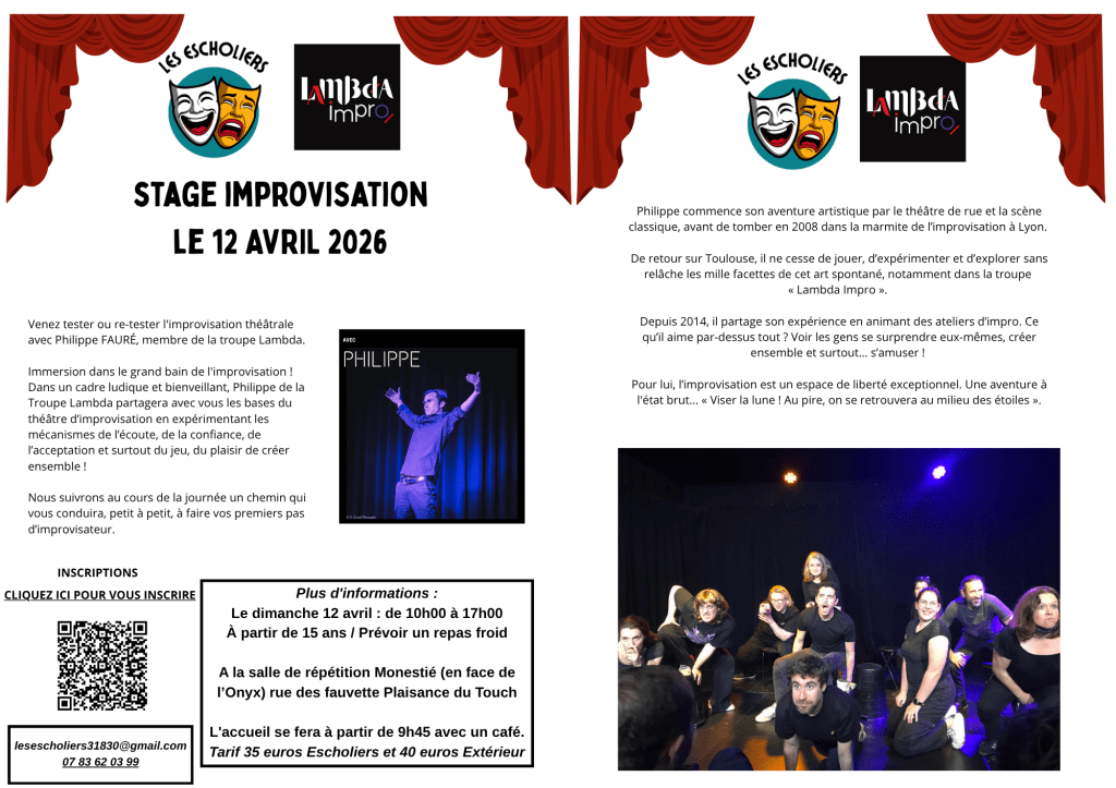 L’association Les Escholiers en association avec LAMBDA IMPRO vous invite à plonger dans l’univers de l’improvisation ! Tout au long de l’année, plusieurs stages seront organisés pour s’amuser, lâcher prise et libérer sa créativité, le tout dans une ambiance conviviale et bienveillante. Que vous soyez curieux, débutant ou déjà passionné, venez tenter l’aventure !